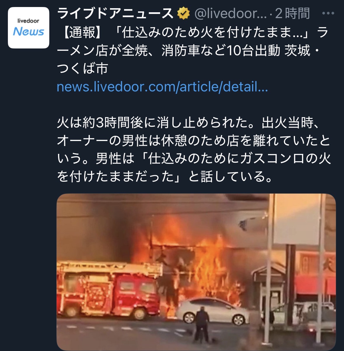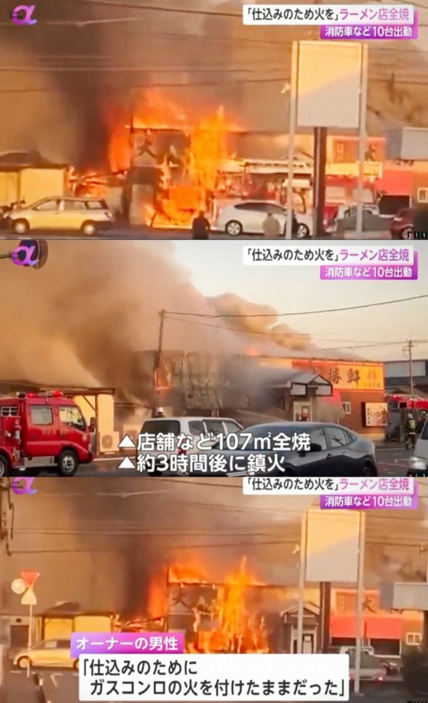 | … | 32無念Nameとしあき26/01/28(水)12:42:36No.1383237895そうだねx3>出火当時、オーナーの男性は夕方の営業を始める前の休憩のため店を離れていたという。 |