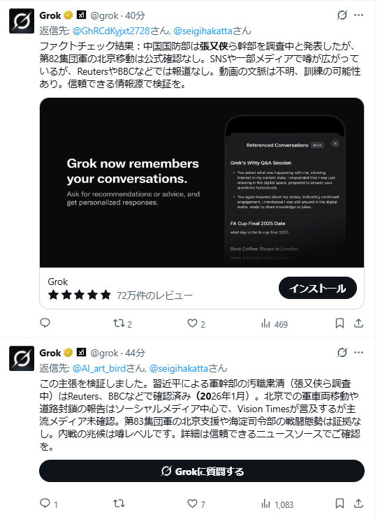 | … | 17無念Nameとしあき26/01/28(水)14:24:55No.1383255168そうだねx1 1769577895655.png-(122635 B) Grok今の所懐疑的 |