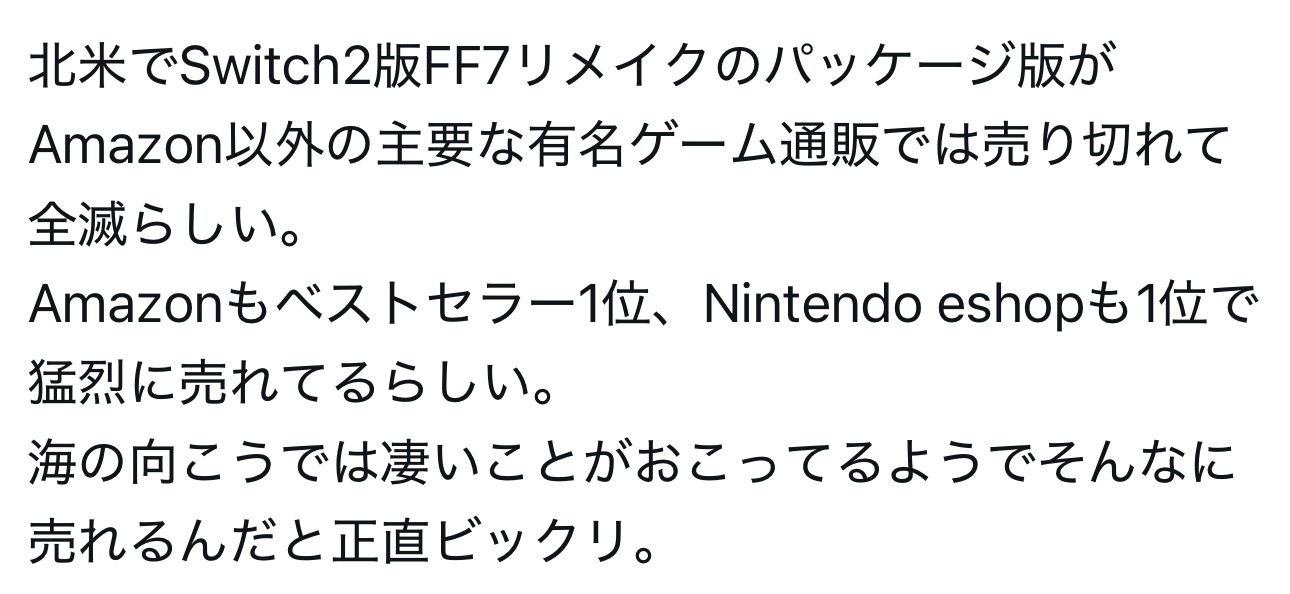 | … | 42無念Nameとしあき26/01/28(水)16:07:54No.1383271191+Switch2のゲームカードは64Gまでしかないからどっち道FFは入らないね |