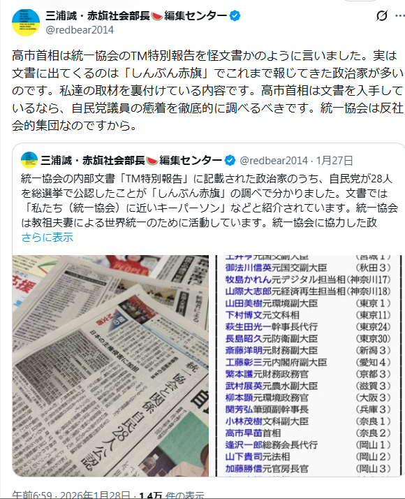 | … | 34無念Nameとしあき26/01/28(水)15:53:12No.1383268840+創価学会というカルトと組んでることは問題にしないのか? |