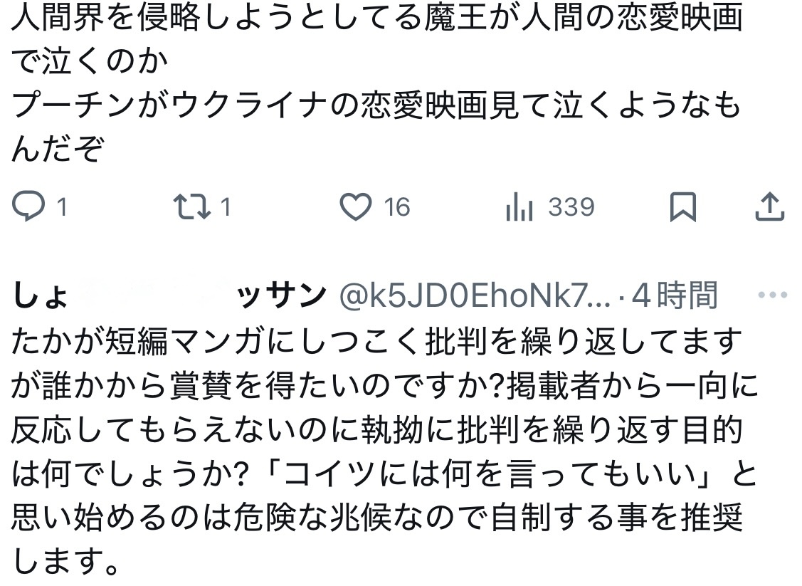 | … | 60無念Nameとしあき26/01/29(木)06:19:33No.1383413709+称賛や反応が欲しくてリプしてるのか!?って考えに至るの怖いよ… |