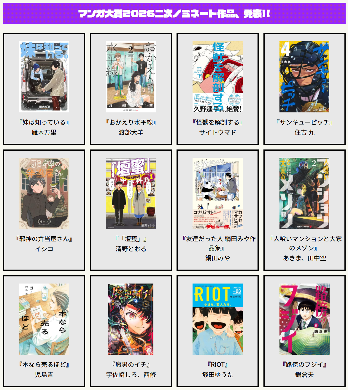 | … | 33無念Nameとしあき26/01/29(木)13:20:10No.1383464292+妹フジイ本は知ってるけど大賞の格じゃないんだよなぁ |