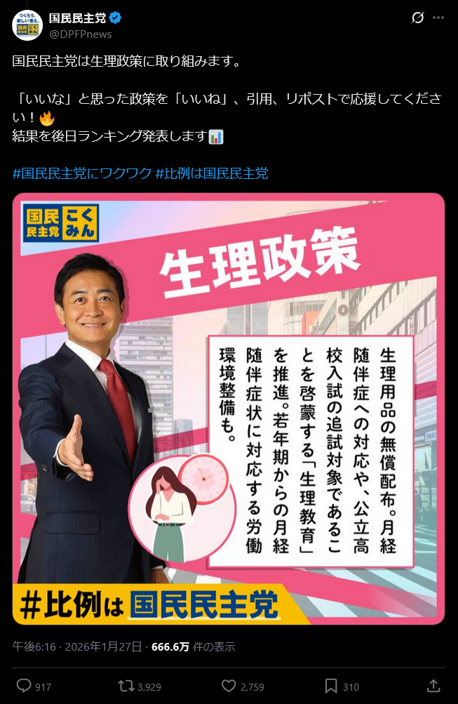 | … | 19無念Nameとしあき26/01/30(金)00:22:24No.1383608624そうだねx4女性のための政策でいいのに直球で生理政策ってすげぇな |