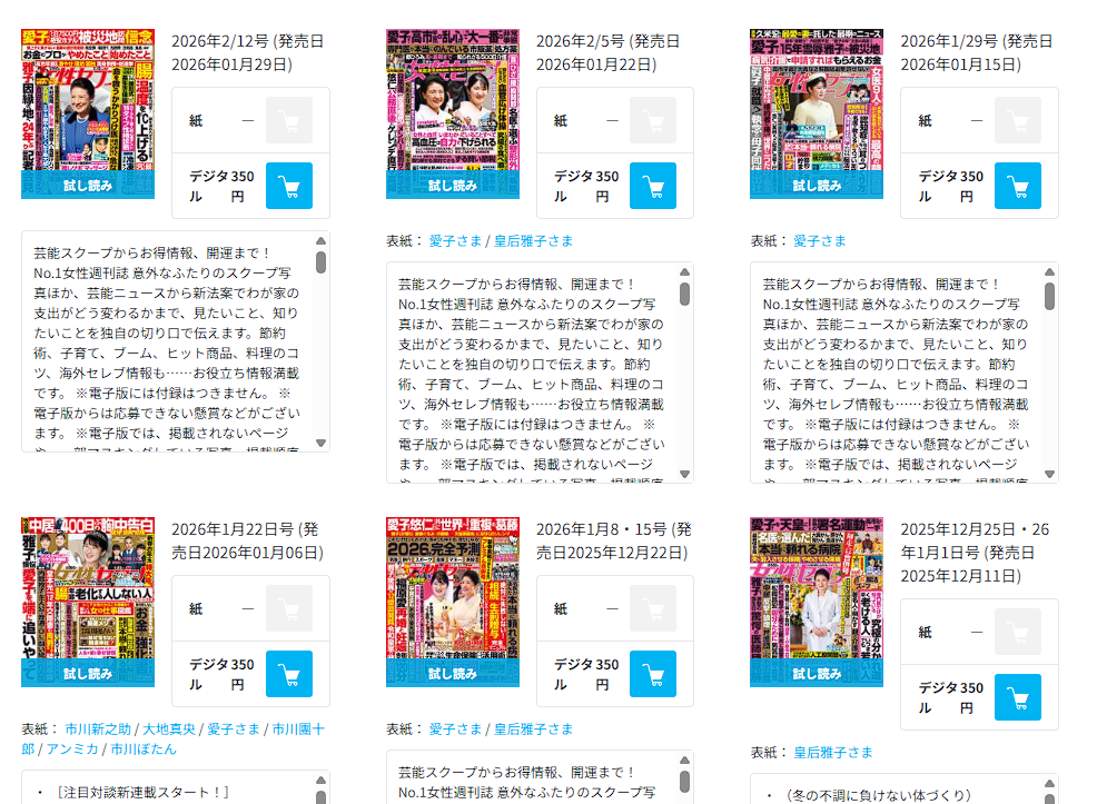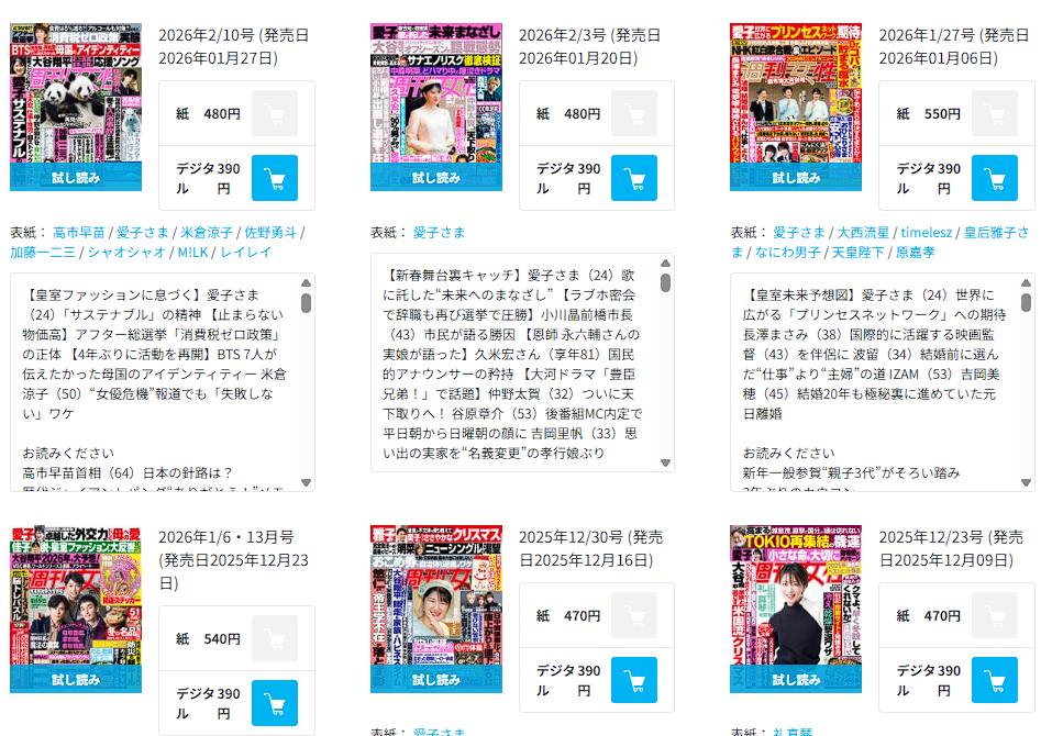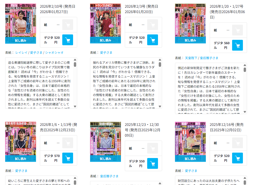 | … | 89無念Nameとしあき26/01/30(金)23:22:14No.1383806987そうだねx4ここんとこずーーーーっと3代女性誌の表紙が愛子か雅子みたいなことになってる |