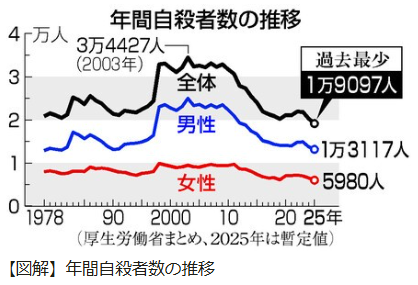 | … | 3無念Nameとしあき26/01/31(土)21:23:24No.1384010671そうだねx1中高年男の自殺減少問題 |