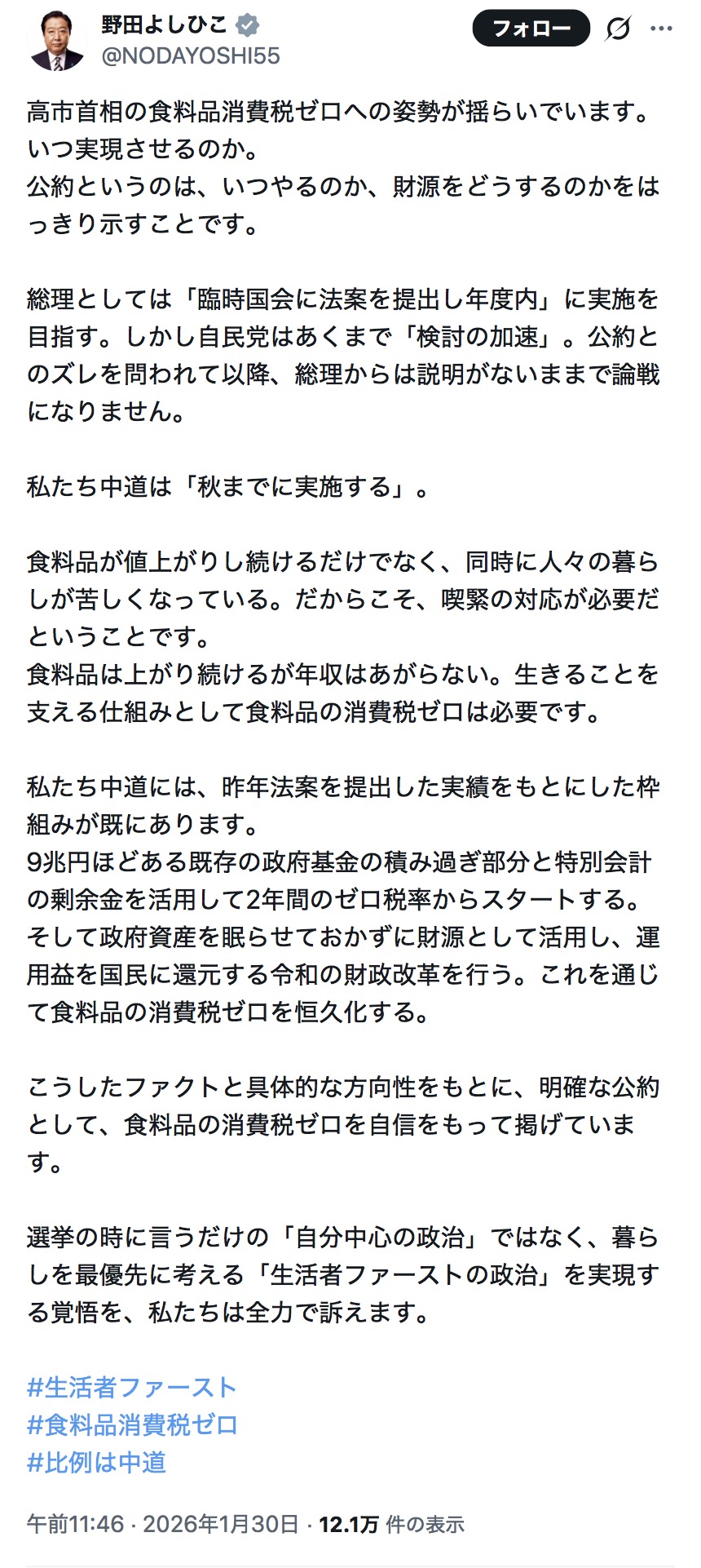 | … | 105無念Nameとしあき26/01/31(土)22:09:20No.1384023918+>「高市首相の食料品消費税ゼロへの姿勢が揺らいでいます。いつ実現させるのか。公約というのは、いつやるのか、財源をどうするのかをはっきり示すことです。」 |
