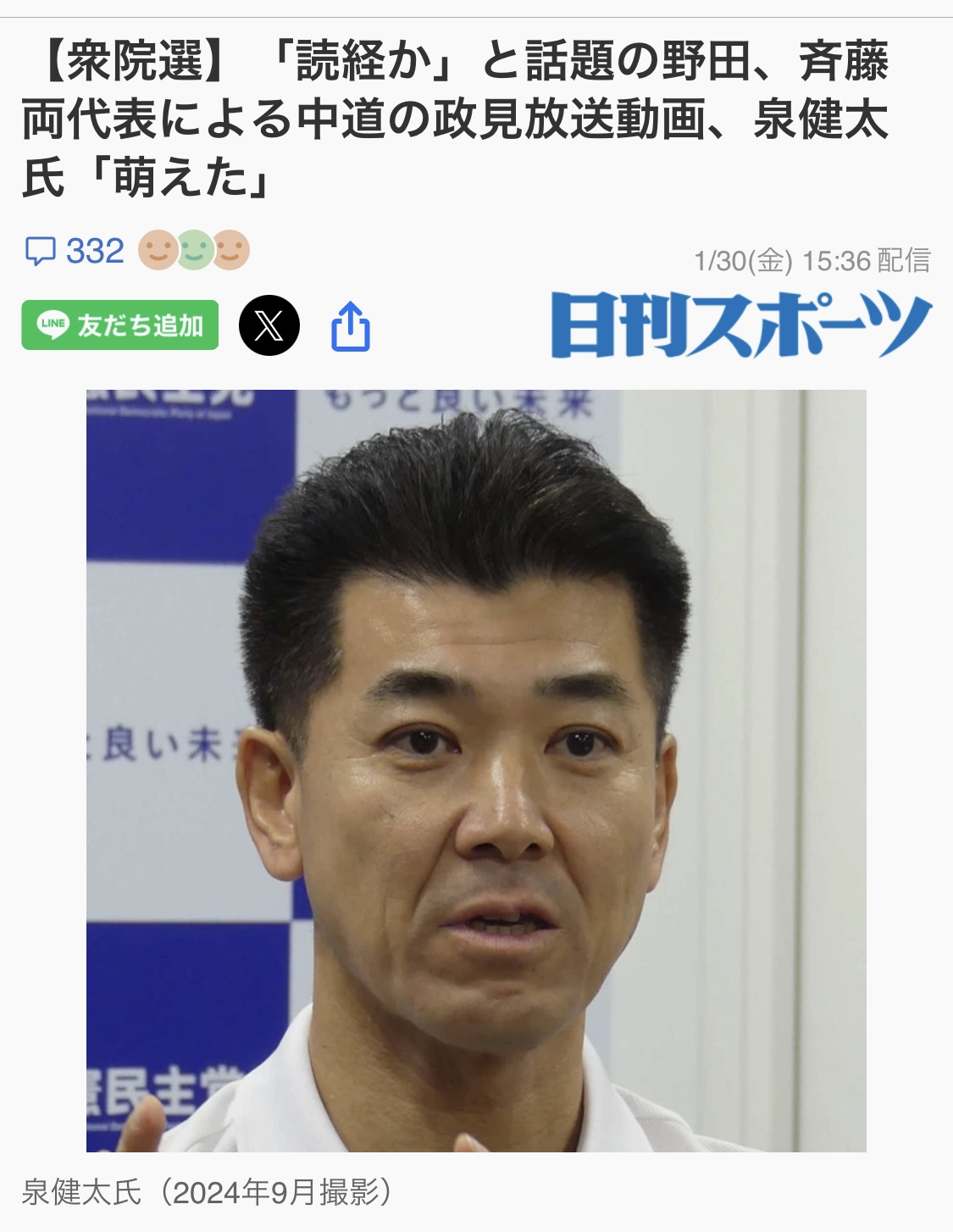 | … | 97無念Nameとしあき26/01/31(土)22:06:23No.1384023014+>公明党の斎藤代表が自民との連立も考えてるって発言したけど元立憲の野田的にはどうなの? |