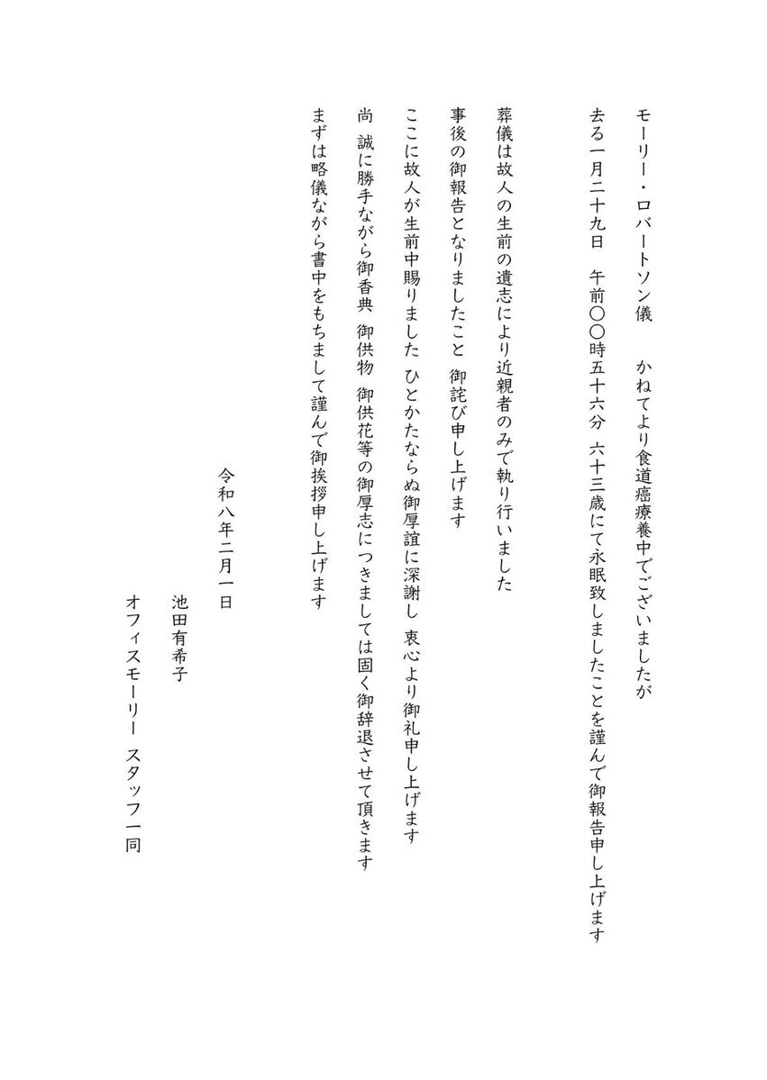 モーリーさんは食道がんの療養中でしたが同年1月29日に永眠。
