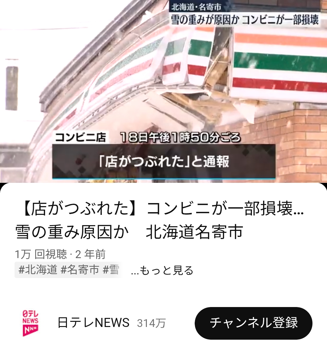 | … | 68無念Nameとしあき26/02/01(日)14:27:57No.1384178692+>雪の重量と屋根の滑り具合を全く考慮してないアホ |