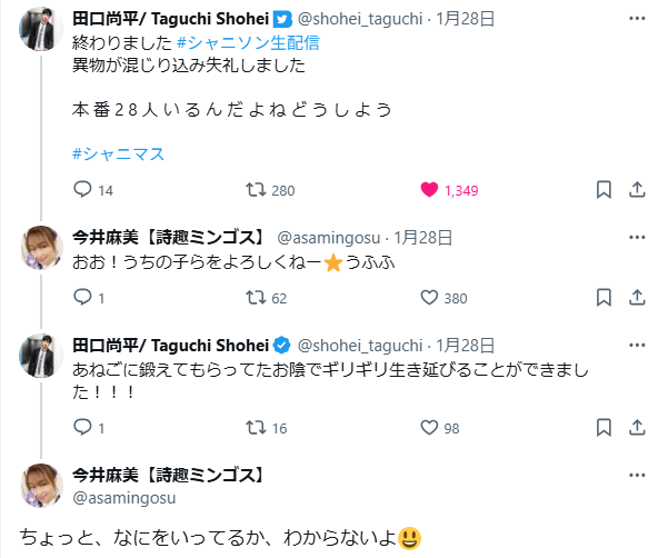 | … | 17無念Nameとしあき26/02/01(日)22:28:24No.1384310744そうだねx1SMMMiloop!!!!は事務所も違うしでもなぜかみんな仲良しだからよし!なイベントなんやな! |