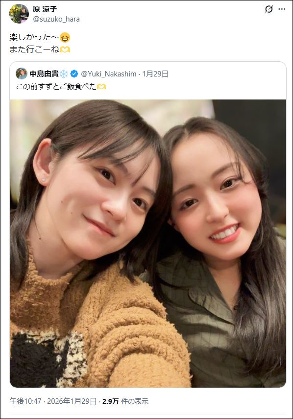 | … | 28無念Nameとしあき26/02/01(日)22:51:07No.1384317510そうだねx2 1769953867870.jpg-(78849 B) すずちゃんしまゆきちゃんと食事に行ってたんやな |