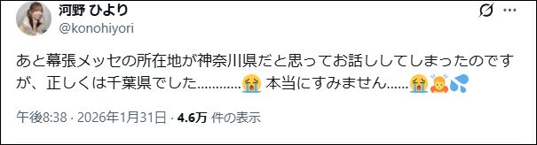 | … | 39無念Nameとしあき26/02/02(月)00:04:18No.1384336468+ 1769958258417.jpg-(23421 B) 幕張メッセの所在地を神奈川県だと勘違いするぴよ・・・ |