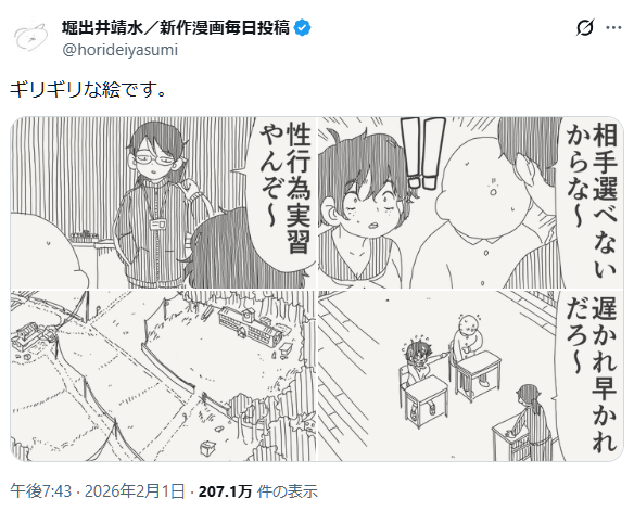 | … | 29無念Nameとしあき26/02/02(月)08:46:52No.1384375599そうだねx1>ほとんどの生徒は性行為実習で童貞処女を卒業したが一部の生徒は既に経験済みだったな |