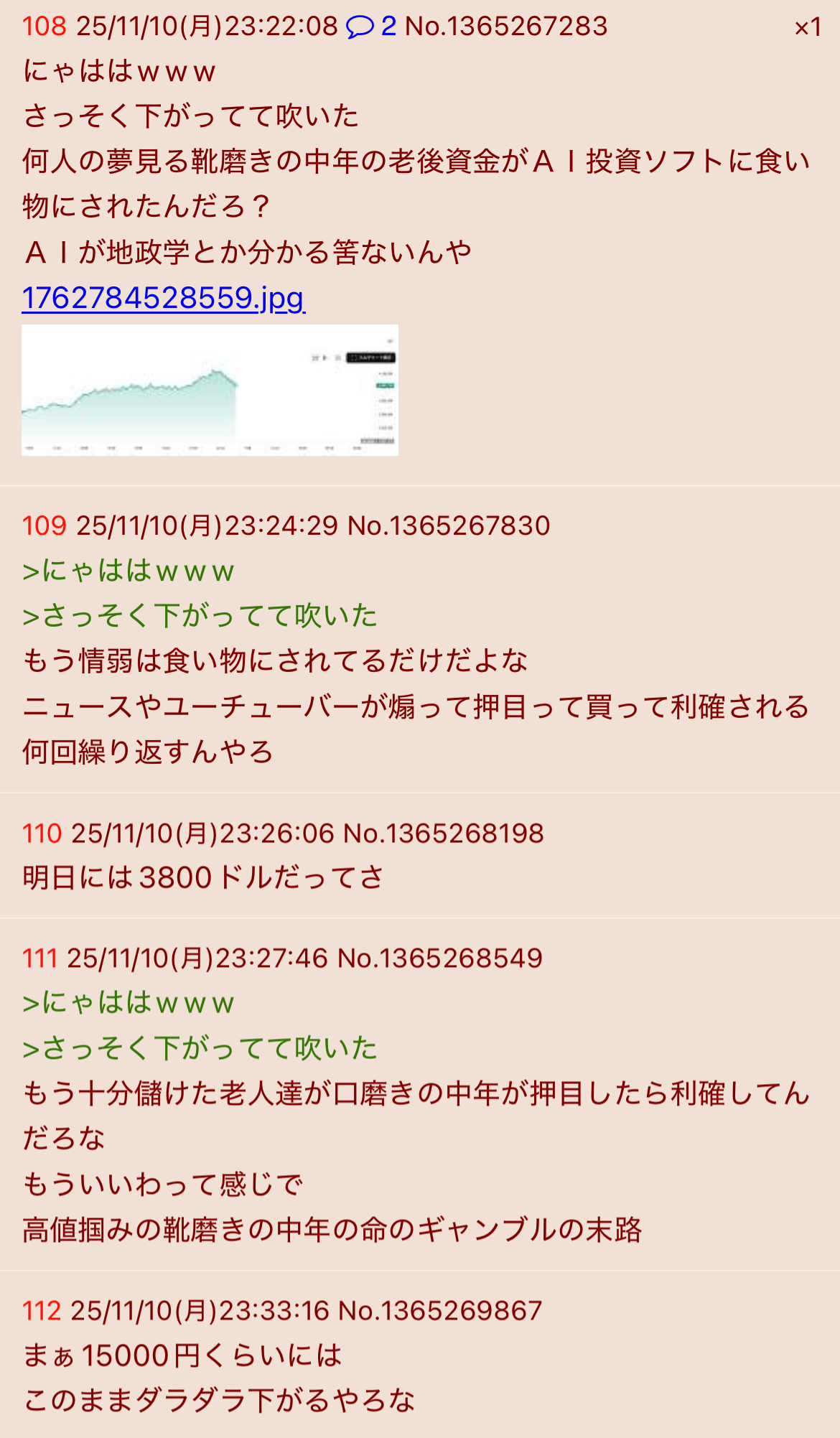 | … | 50無念Nameとしあき26/02/02(月)15:00:09No.1384425604+毎回なんか暴落する度にここでもう終わりだっていうスレ立つよね |