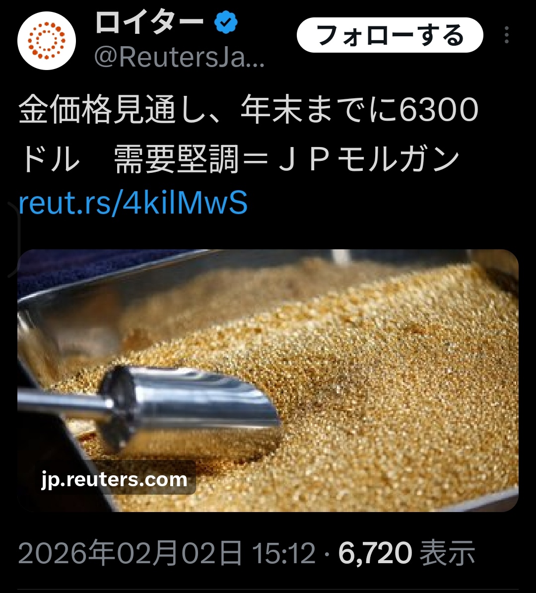 | … | 88無念Nameとしあき26/02/02(月)16:15:28No.1384436947+ゴールドはもう安全資産じゃなくて投機銘柄だからな |