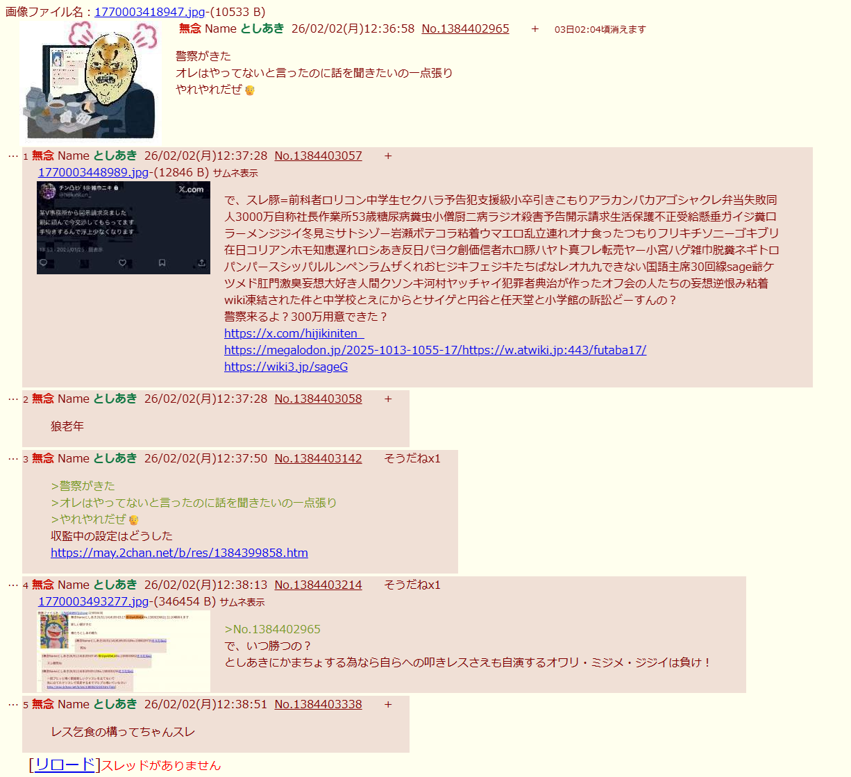 | … | 69無念Nameとしあき26/02/02(月)14:42:52No.1384423226+で、おまわりさんいつくんの? |