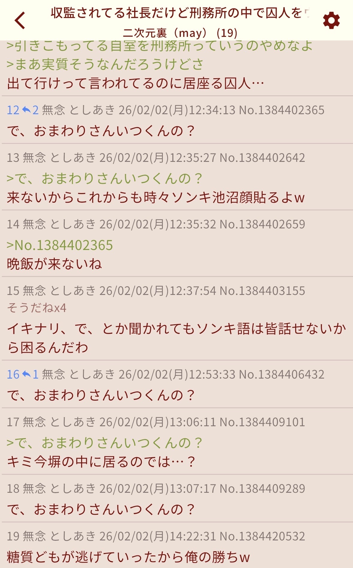 | … | 32無念Nameとしあき26/02/02(月)13:08:48No.1384409539そうだねx7>言っとくけど5分以内にレスなかったら糖質の負けだからね |