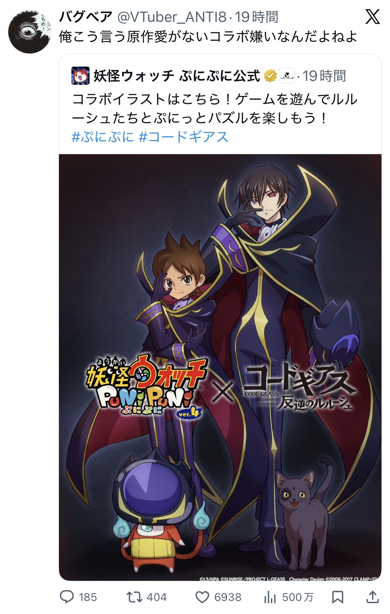 | … | 8無念Nameとしあき26/02/02(月)13:33:51No.1384413520+そもそも妖怪ウォッチとギアスってファン層違くない? |