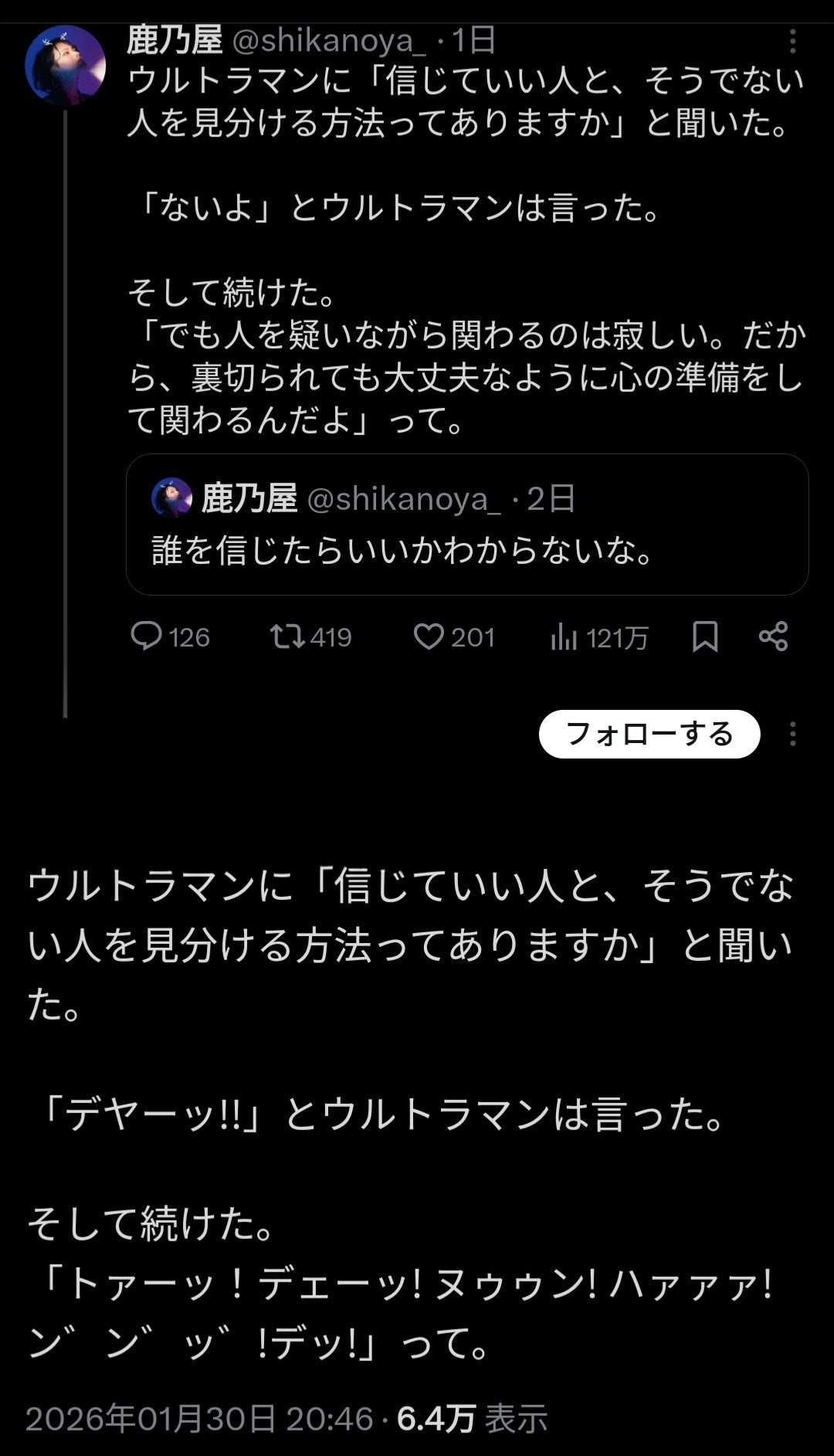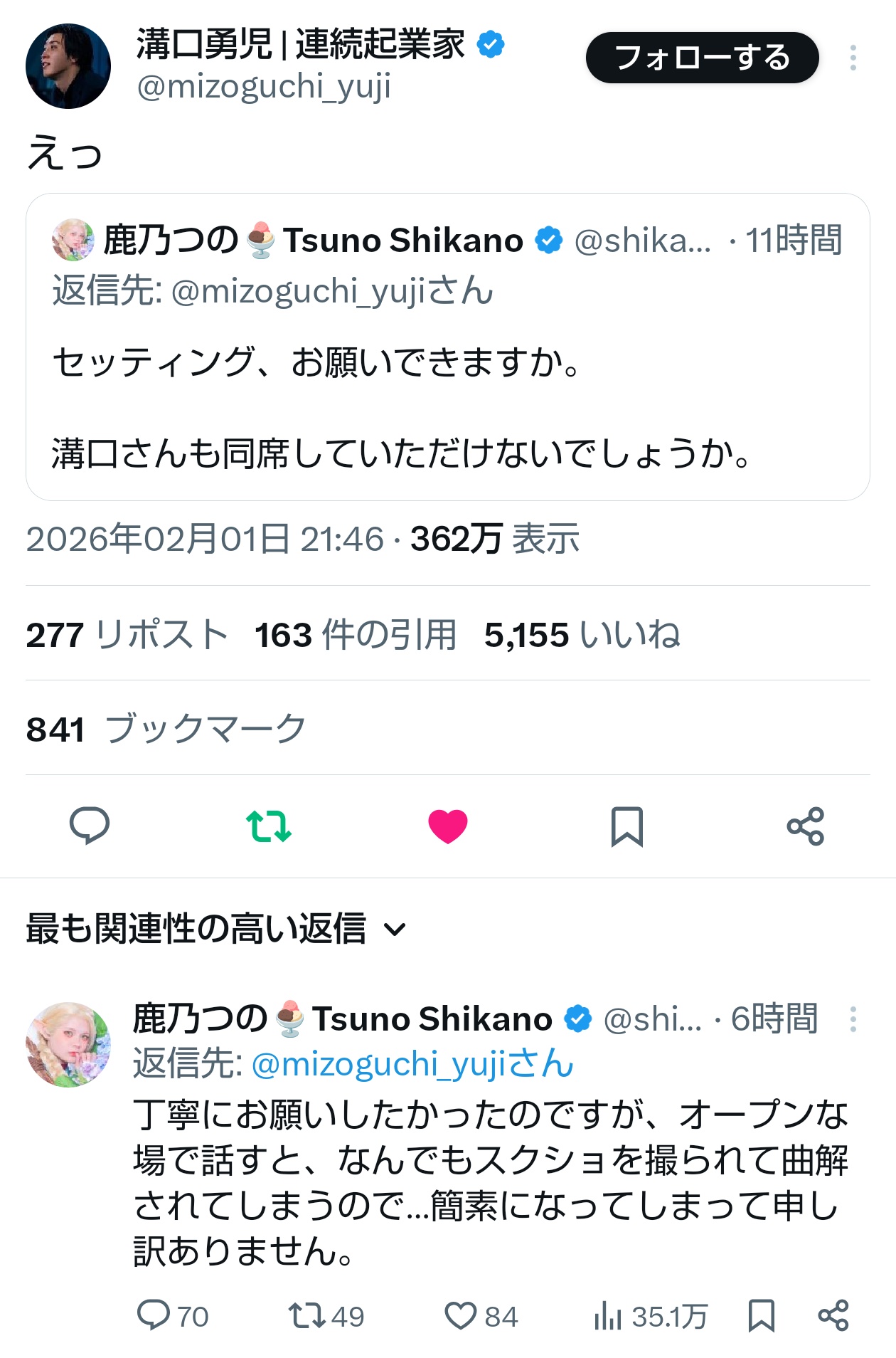 | … | 85無念Nameとしあき26/02/02(月)22:01:13No.1384517902そうだねx4>なんかフォローされたんだけどどうしよう |