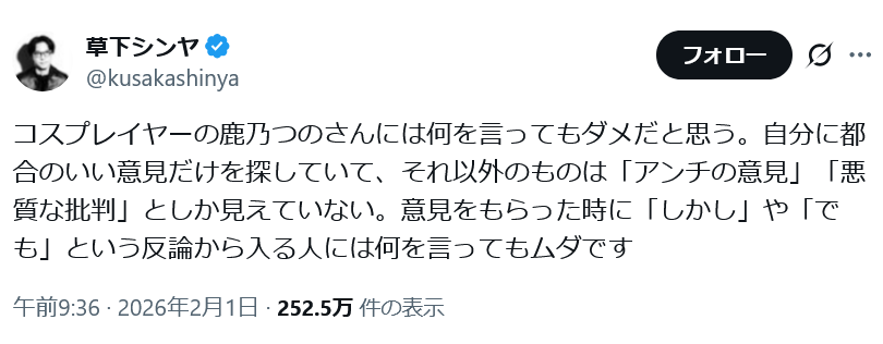 | … | 3無念Nameとしあき26/02/02(月)18:54:47No.1384467176そうだねx11もうコスプレイヤーへのネガキャンとしか思えないムーブしてね? |