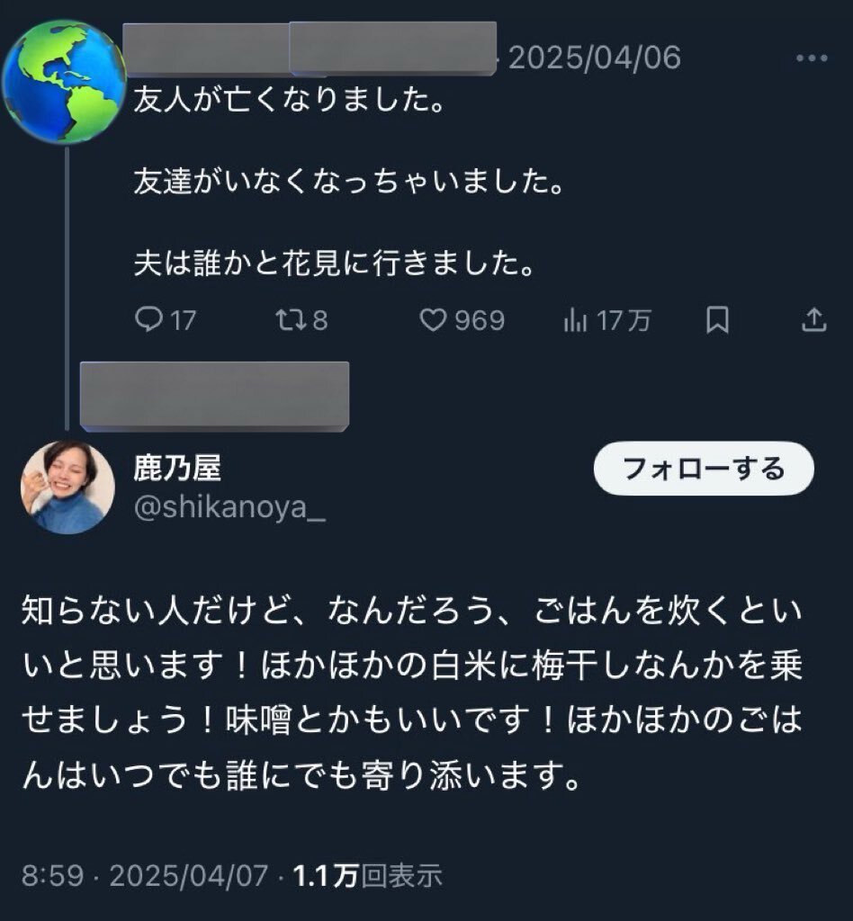 | … | 50無念Nameとしあき26/02/02(月)19:51:45No.1384481012+自分が過去発言した心ないヨシヨシ待ち発言とほかほかご飯発言のリプばかり飛んで来てて因果応報とはこういうものなのかと |