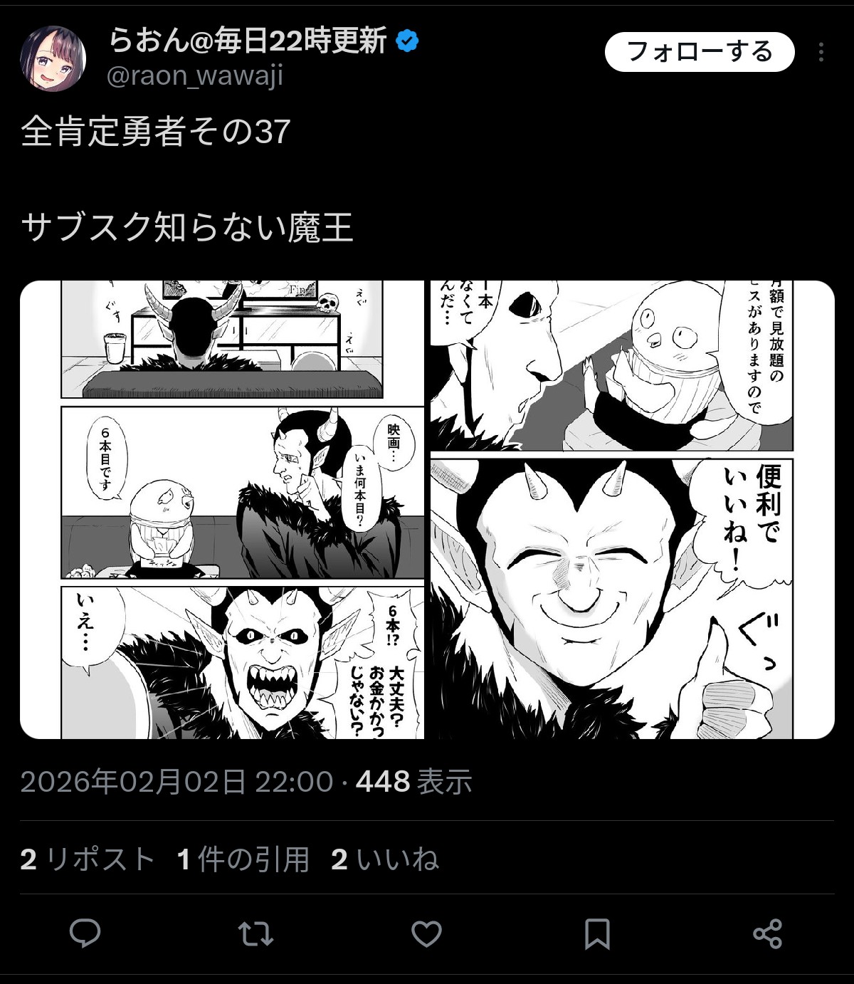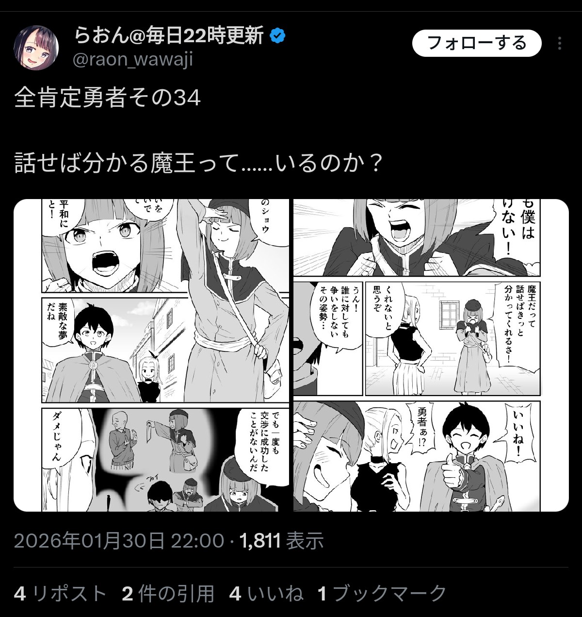 | … | 756無念Nameとしあき26/02/02(月)22:43:54No.1384528902+あくまで侵略を阻止する勇者を倒すために待ってるのにいつの間にか勇者を待つこと自体が目的になってるのが実に先生らしい |