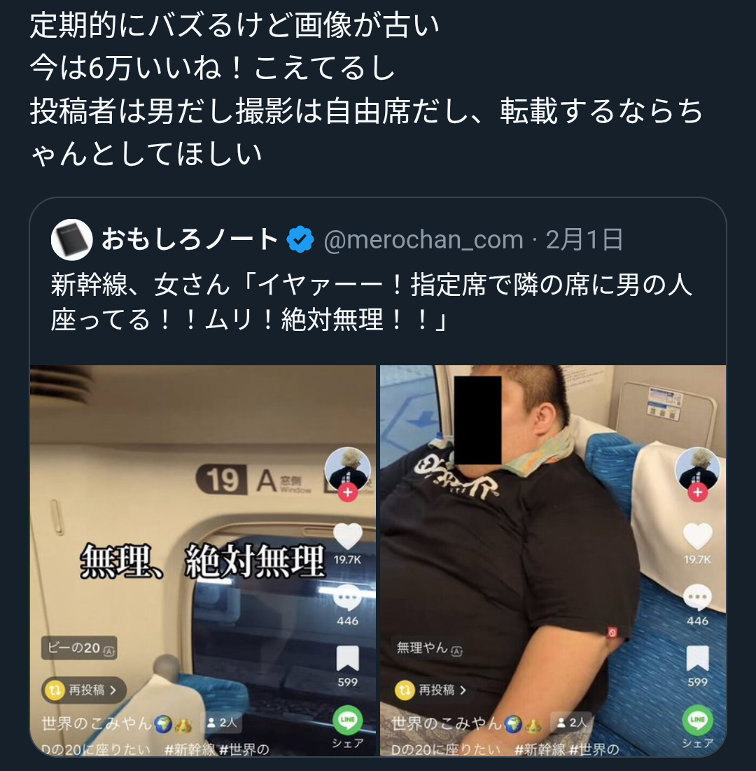 | … | 24無念Nameとしあき26/02/03(火)15:16:18No.1384637337そうだねx1どうやってもはみ出すデブは自分で申告したらグリーン車の席に替えてもらえる |