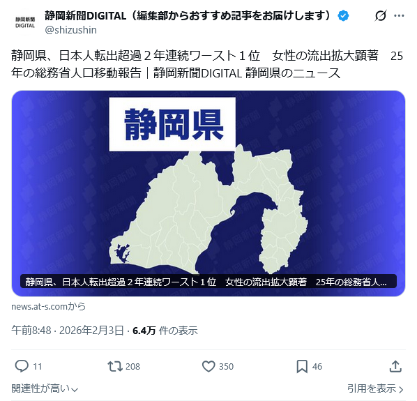 | … | 26無念Nameとしあき26/02/04(水)00:27:40No.1384765822+>静岡県なんて大都市へのアクセスもいいし工業あるしそこそこ発展してるのにそれでも出ていくって、もう対処のしようが無いだろ |