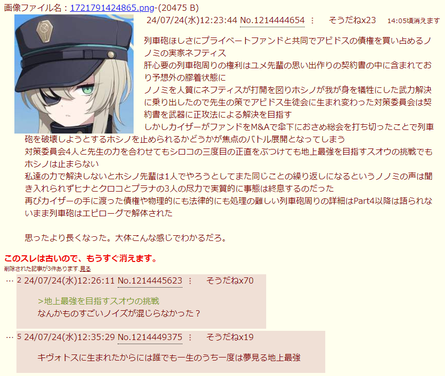 | … | 181無念Nameとしあき26/02/04(水)00:43:34No.1384768856+>常識的に考えればメインストーリーで主要人物を務めた部活や生徒になるはずわよけど |