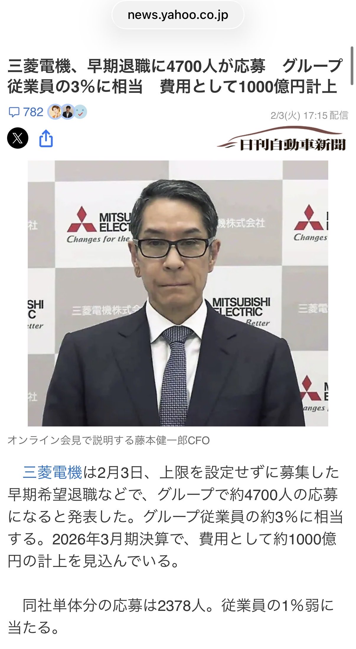 | … | 87無念Nameとしあき26/02/04(水)08:11:20 ID:gwl7ixzcNo.1384794906+ 1770160280280.png-(1499523 B) 三菱電機4700人自主退社ので |