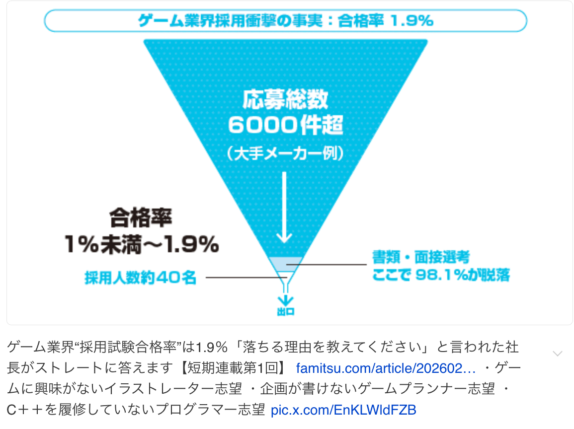 | … | 336無念Nameとしあき26/02/04(水)15:39:22No.1384860614そうだねx2>今のゲーム業界ってグラもプログラミングも音楽もコミュ力も全部1人で出来ますみたいな超人しか求めてねぇんじゃねぇかな |