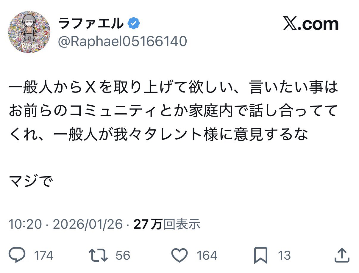 | … | 51無念Nameとしあき26/02/04(水)22:13:01No.1384951091+Xの仕組みよく知らんのだけど27万閲覧されてんだよね? |