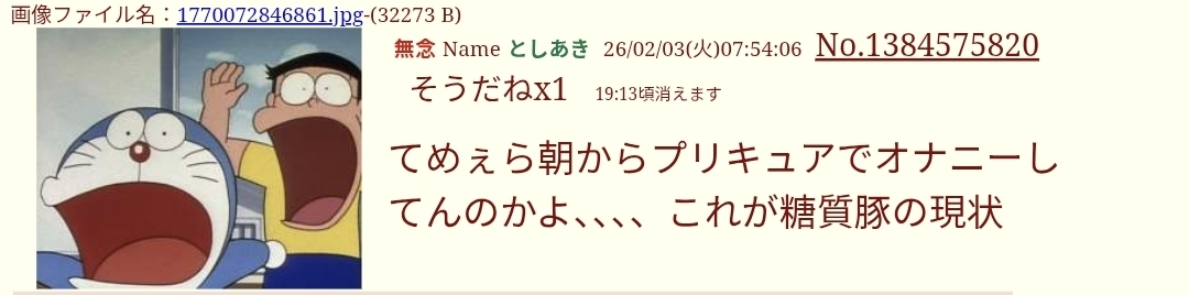 | … | 1無念Nameとしあき26/02/05(木)09:10:23No.1385017227+一回ブヒッと鳴く都度新しいクソスレを立てないで |