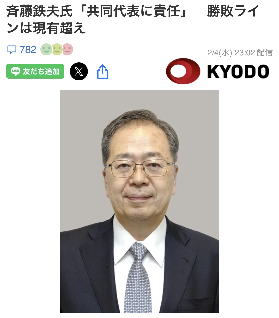 | … | 55無念Nameとしあき26/02/05(木)11:02:55No.1385030124+>斉藤鉄夫氏「共同代表に責任」 勝敗ラインは現有超え |