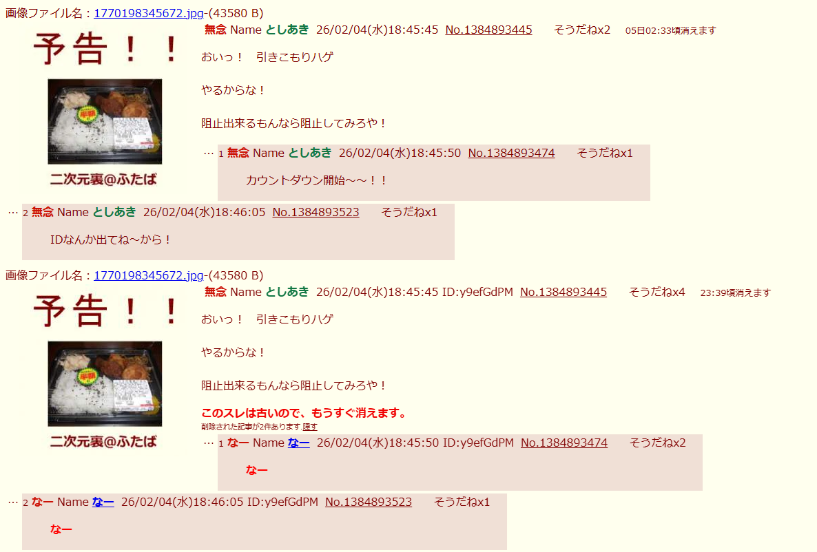 | … | 79無念Nameとしあき26/02/05(木)10:27:14No.1385025633+>スレ豚また「いつくんの?」「通報効果ないな」等のコピペを繰り返すの? |