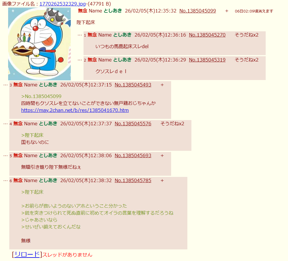 | … | 86無念Nameとしあき26/02/05(木)12:44:23No.1385047184そうだねx4 1770263063698.png-(198947 B) 陛下()起床を消して逃げたな |