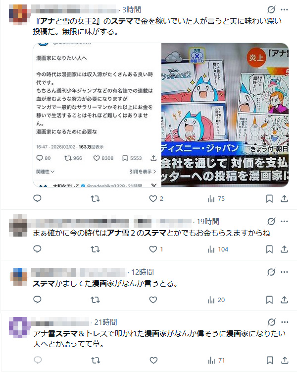 | … | 91無念Nameとしあき26/02/05(木)15:59:50 IP:106.155.*(au-net.ne.jp)No.1385080131そうだねx4>自分は漫画家で儲かってますアピールじゃない? |