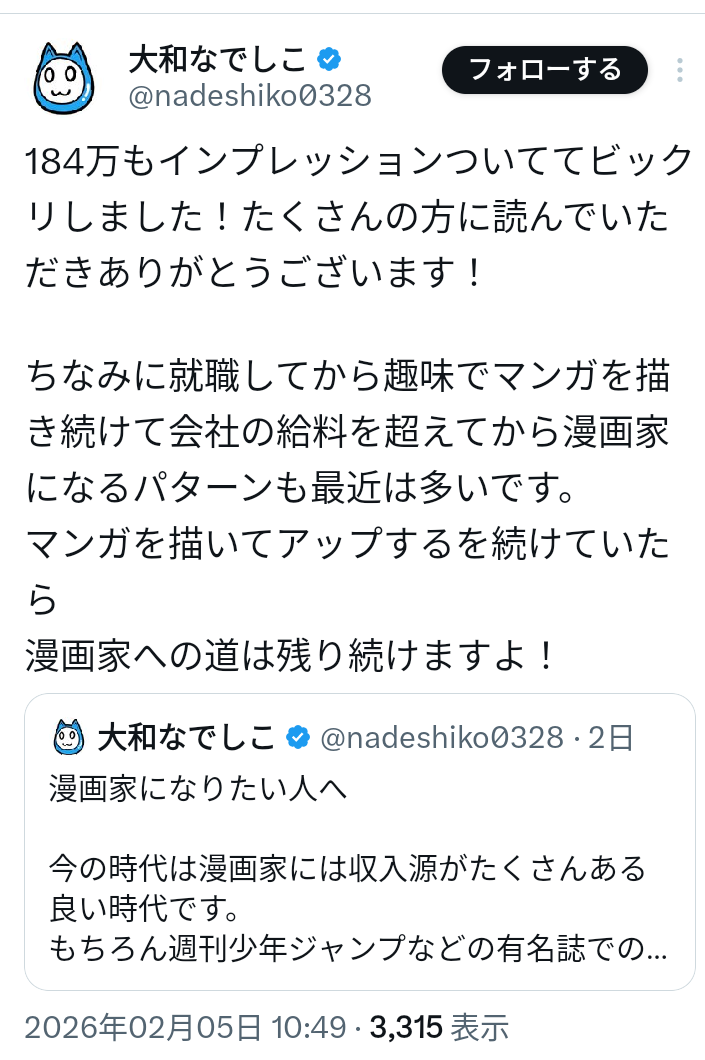 | … | 81無念Nameとしあき26/02/05(木)15:32:11 IP:49.106.*(spmode.ne.jp)No.1385075572そうだねx2>「みんな漫画家になろー!会社員より儲かるよー!」とか言ってるのは一体なんなんですかね |