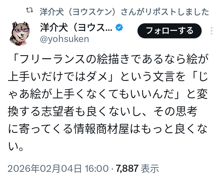 | … | 73無念Nameとしあき26/02/05(木)15:16:15 IP:1.115.*(bbtec.net)No.1385073018+>犬みたいな漫画家になりたいって人いないからアドバイスいりませんよ |