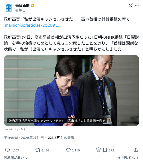 | … | 86無念Nameとしあき26/02/05(木)22:19:49No.1385169171そうだねx3テレビ出られない病気で総理大臣はやれるつもりでおるん? |