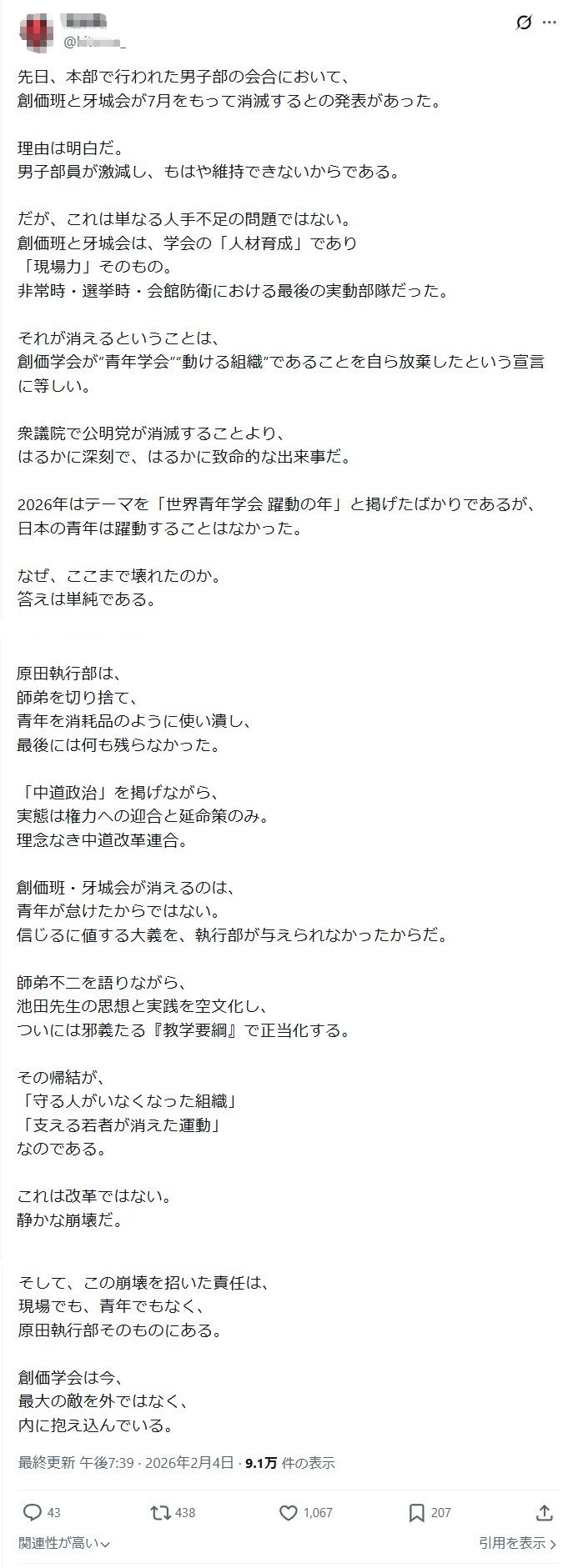 | … | 13無念Nameとしあき26/02/06(金)04:15:52No.1385219342そうだねx2創価学会も中道が大敗したら集票マシーンじゃないことがバレて崩壊が加速するな |