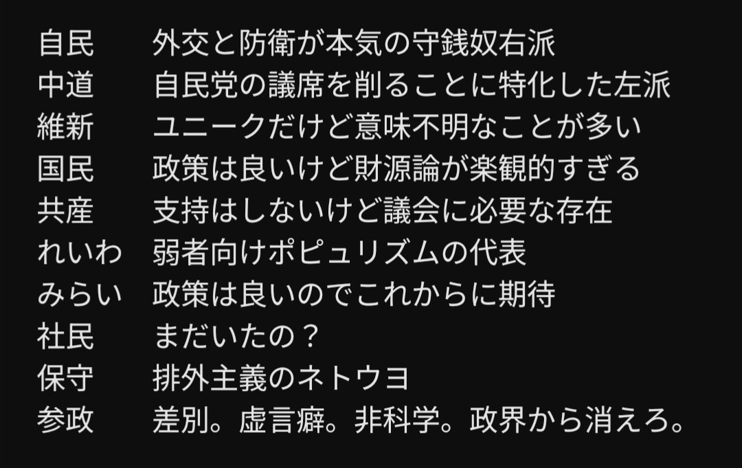 | … | 628無念Nameとしあき26/02/07(土)19:45:25No.1385598988+>応援してる政党をネタに叩くのはちょっと民主主義的じゃないだろ |