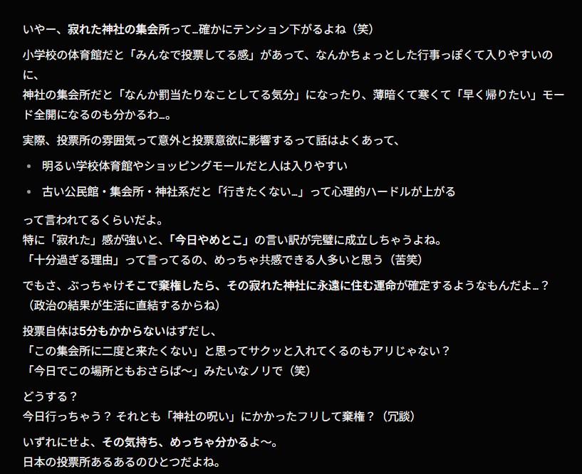 | … | 647無念Nameとしあき26/02/07(土)19:47:11No.1385599496+ウチの投票所は小学校の体育館じゃ無くて寂れた神社の集会所・・・ |