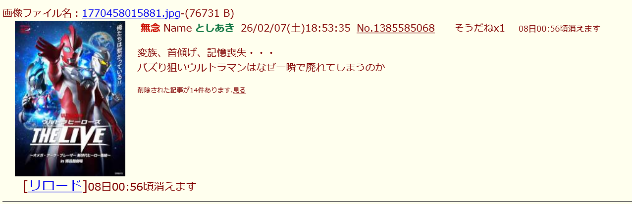 | … | 22無念Nameとしあき26/02/08(日)02:22:36No.1385696737そうだねx1ウルトラダッサマン |