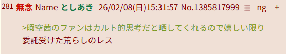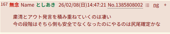 | … | 57無念Nameとしあき26/02/08(日)15:42:12No.1385820333そうだねx2>根拠無き脳内妄想レス |