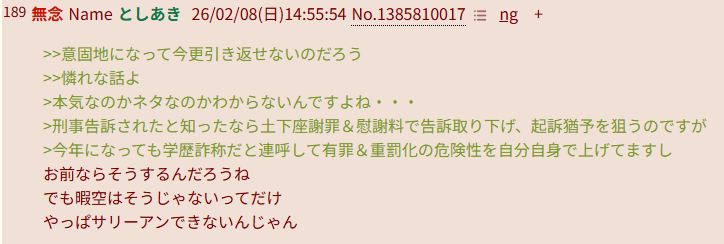 | … | 36無念Nameとしあき26/02/08(日)15:07:33No.1385812681+ 1770530853312.png-(18998 B) 脳内だと東大卒の弁護士がスレに書き込んでいるということになっているらしい |