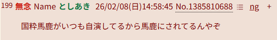 | … | 11無念Nameとしあき26/02/08(日)14:43:09No.1385807063そうだねx3でも国粋馬鹿はいつも断定してるしな |