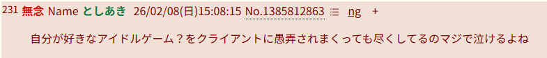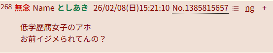 | … | 70無念Nameとしあき26/02/08(日)15:57:42No.1385824076+されるのが嫌ならお前もやめたら? |