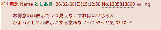 | … | 28無念Nameとしあき26/02/08(日)14:58:11No.1385810548+ 1770530291968.png-(63442 B) この手の同一性を断言する書き込みは無視されるのに |