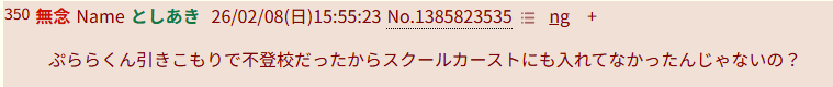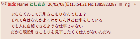 | … | 30無念Nameとしあき26/02/08(日)15:00:55No.1385811170そうだねx1>やたら引きこもりを見下すのって「普段は座敷牢だけど親の許可あれば家から出る意思あるから俺の方が上」とか考えてらっしゃる? |